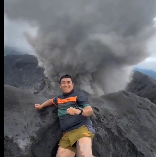 Turistas posan para foto durante momento de erupción de un volcán en Indonesia