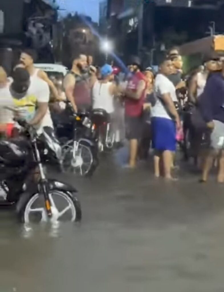 Mientras las autoridades activaban alertas y equipos de respuesta ante el paso de la tormenta tropical Melissa en sectores como El Torito, en Villa Mella el asfalto cubierto de agua fue el centro de un teteo multitudinario. Allí, la música competía con el sonido de la lluvia, mientras motocicletas cruzaban charcos profundos y varias personas se sumergían hasta la cintura, celebrando entre risas y grabando cada momento con sus celulares.
